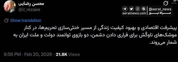 محسن رضایی در توئیتر این پست را به اشتراک گذاشت.